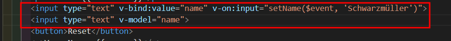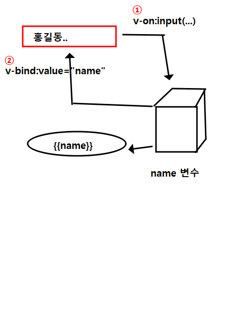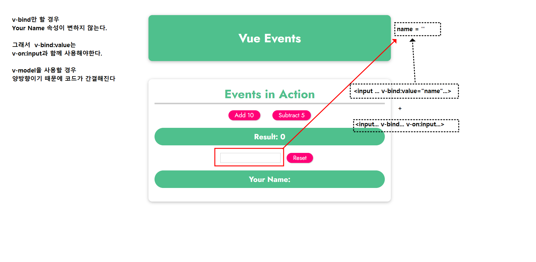 v-on은 사용자가 입력한 이름이 name 변수값으로 설정한다.
