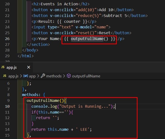 - 요구3: html 파일에서는 vue 메소드로 사용하여 보여준다.
