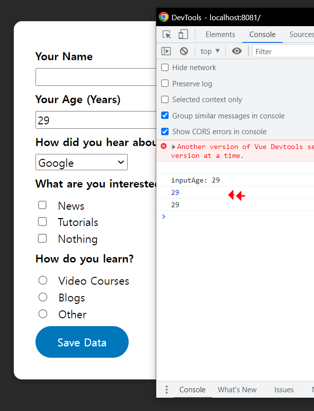 v-model은 29 + 10 = 39가 되었고