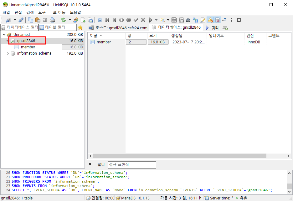스키마 명을 나는 member 테이블 명으로 넣고 있었다.