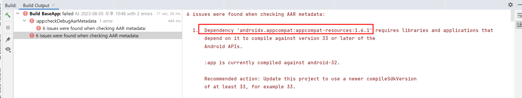 1.6.1 은 Android API 버전 33 이후가 필요하단다.