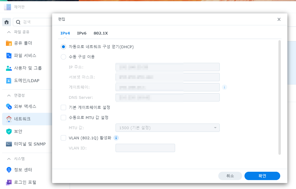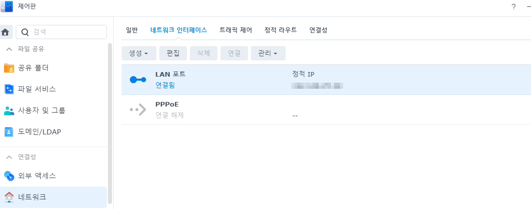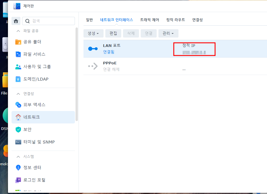 접속하여 나스의 정적IP를