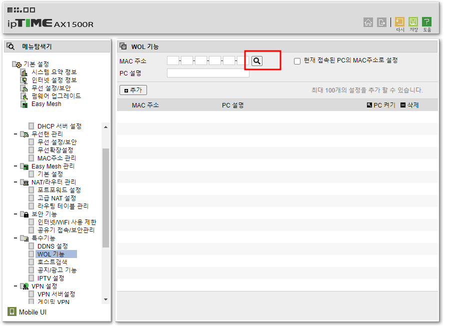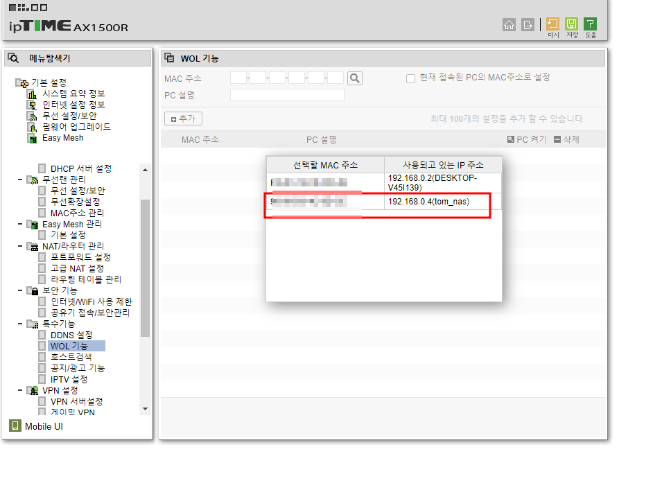 WOL설정할 기기 맥주소를 등록 완료했다면