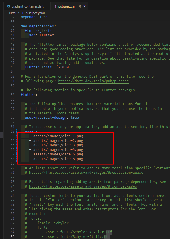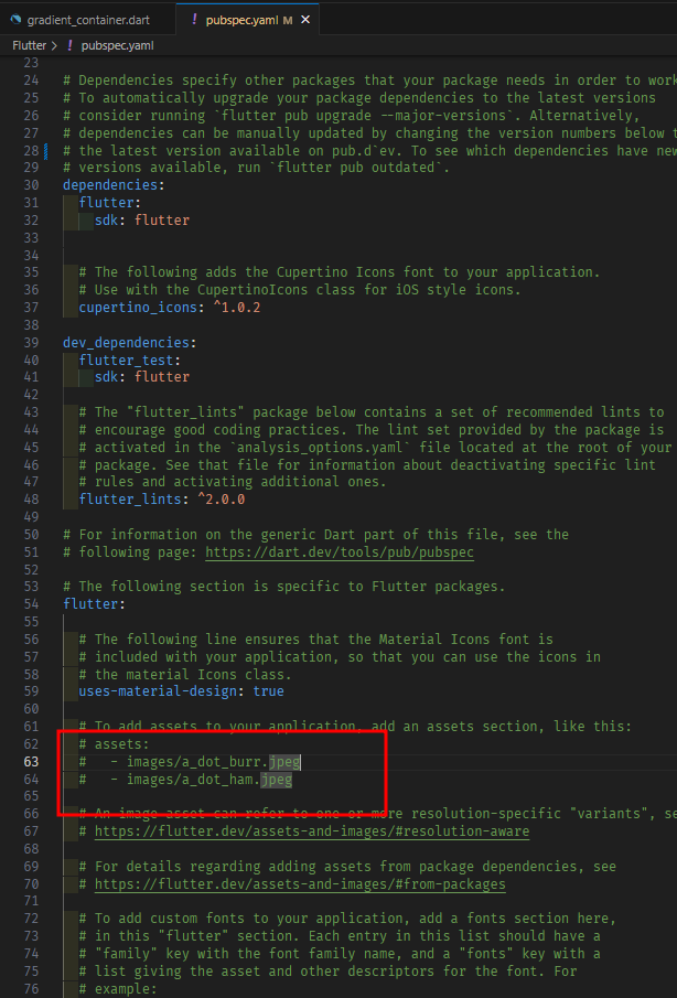 2. pubspec.yml 파일에서 assets 부분을 주석 해제한 뒤 추가한 파일을 넣어준다.