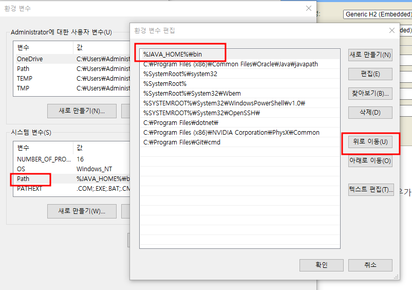 - 환경변수 path java 디렉토리 최상위로 올려주기
