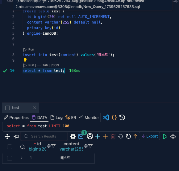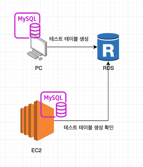 RDS를 붙여 테스트 테이블이 잘 되었나 확인한다.