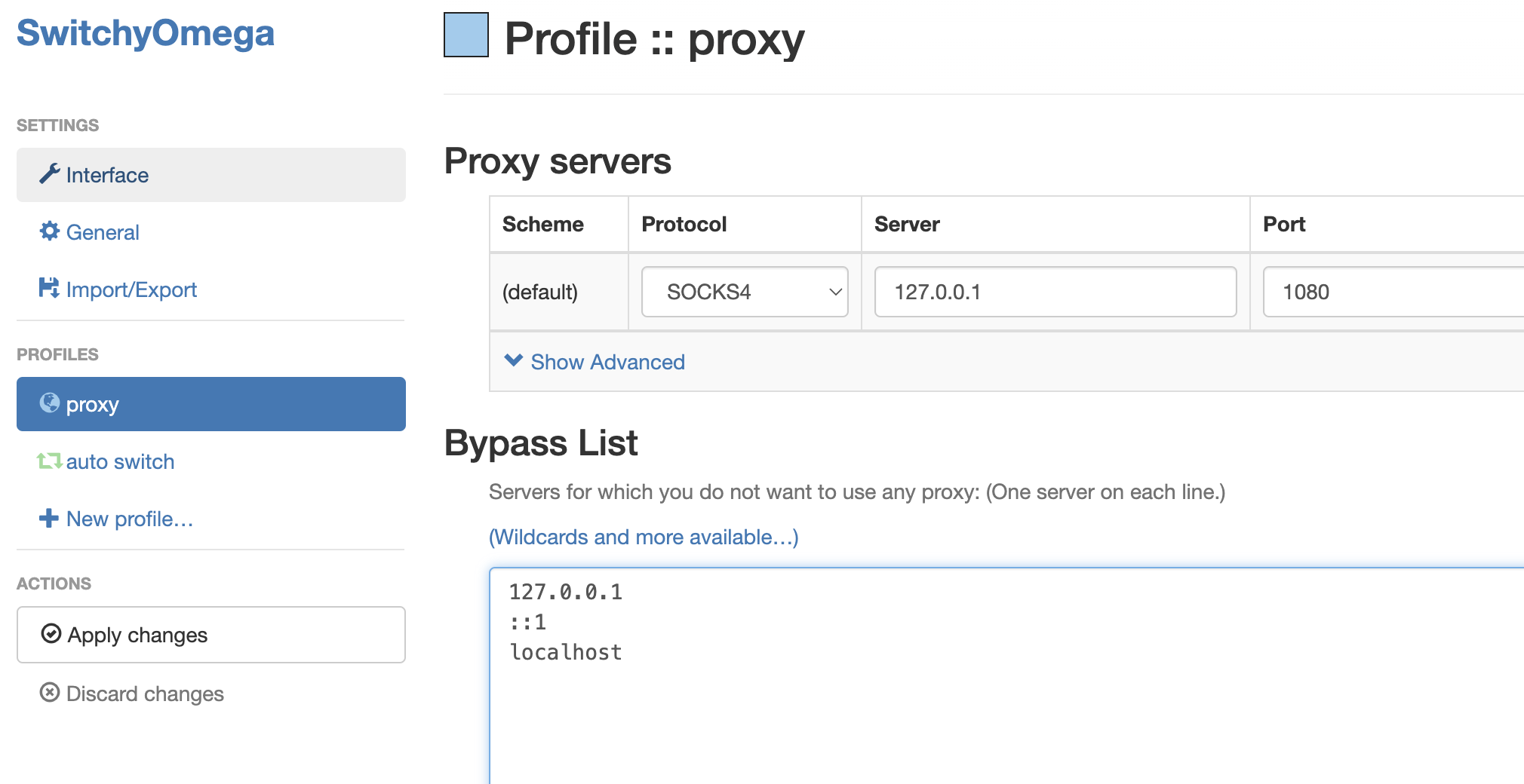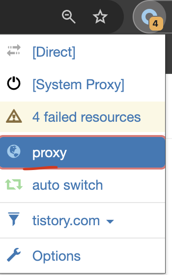 2. 브라우저가 다른 포트로 온 데이터를 받을 수 있도록 Extension 설치(크롬은 switch omega, 파이어폭스는 기본으로 제공하는 걸로 알고 있음)