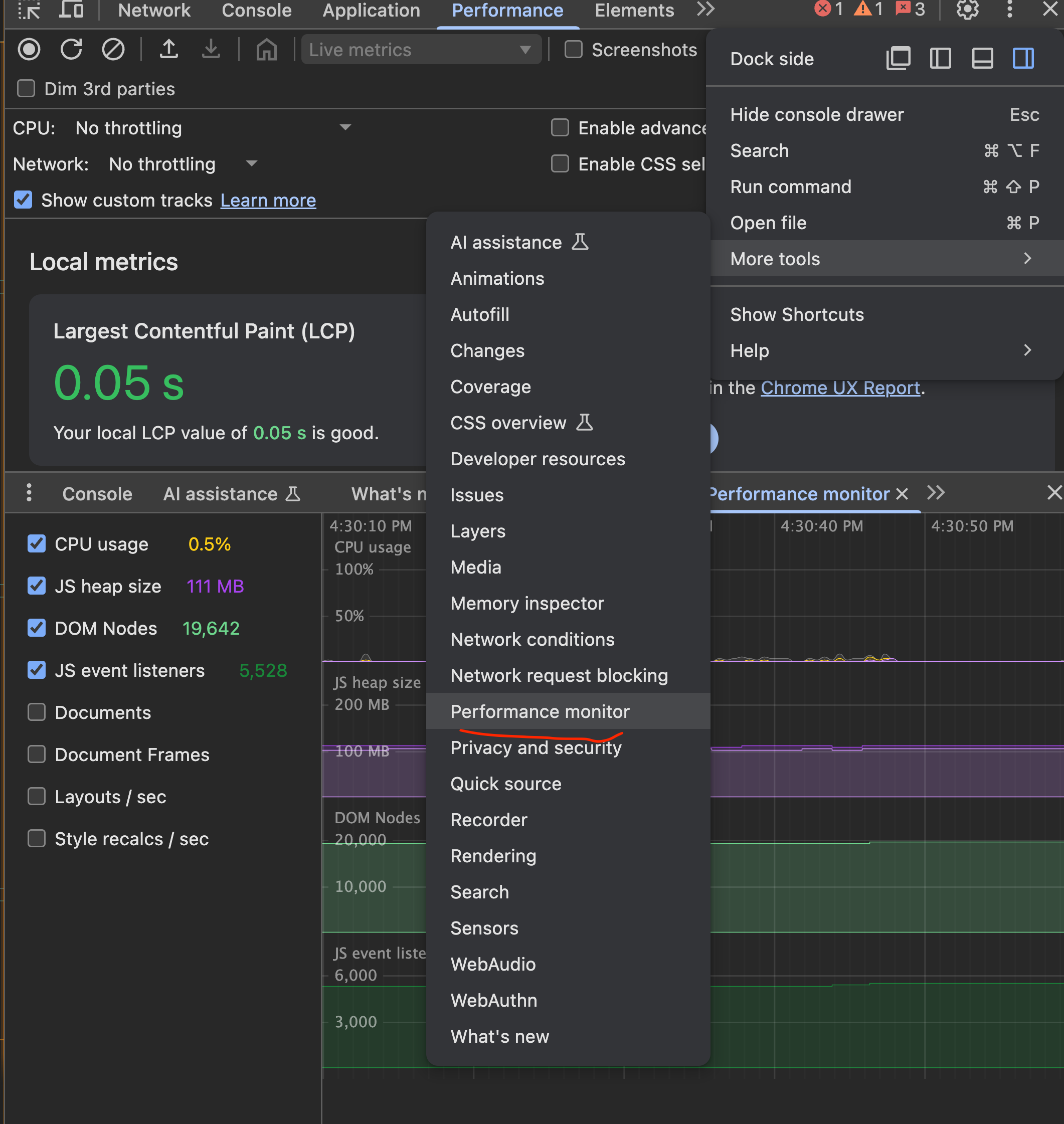 Memory, Document Node 숫자, EventListener 실시간 체크가 가능하다