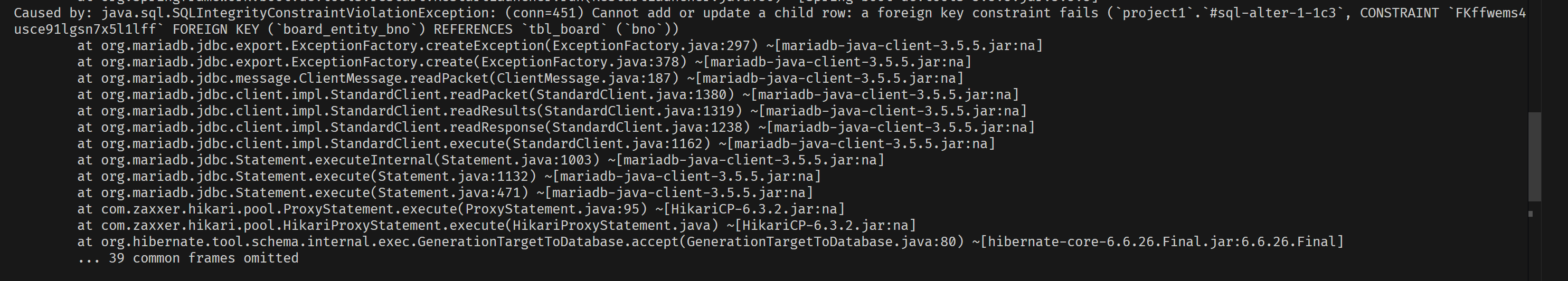 Caused by: java.sql.SQLIntegrityConstraintViolationException: (conn=451) Cannot add or update a child row: a foreign key constraint fails (`project1`.`#sql-alter-1-1c3`, CONSTRAINT `FKffwems4usce91lgsn7x5l1lff` FOREIGN KEY (`board_entity_bno`) REFERENCES `tbl_board` (`bno`))