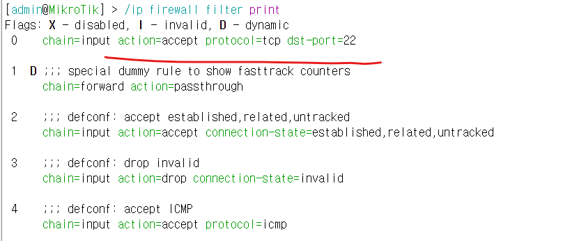 /ip firewall filter add chain=input protocol=tcp dst-port=22 action=accept place-before=0
